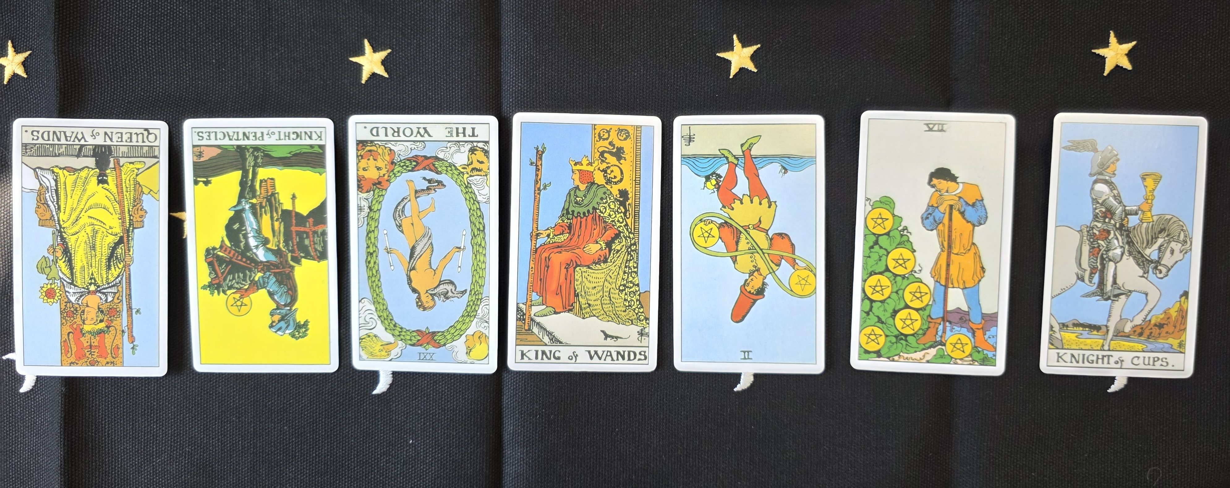 요일별 카드에서 전반적인 운세에서 나온 월드카드, 동전7, 동전2 카드, 지팡이 왕 카드가 반복해서 나왔다.